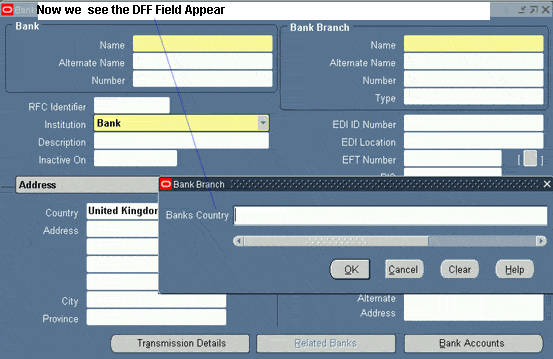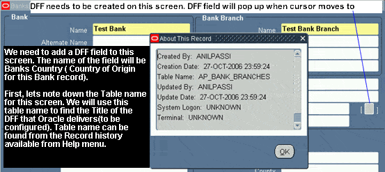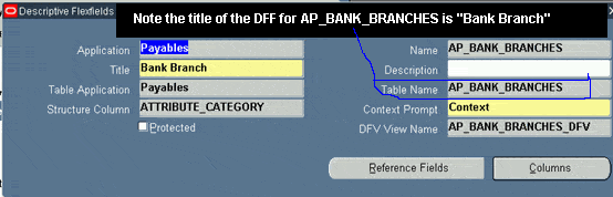 1. Navigate to the DFF Registration screen in Oracle Apps and query on Table AP_BANK_BRANCES. Now click on Reference Field
