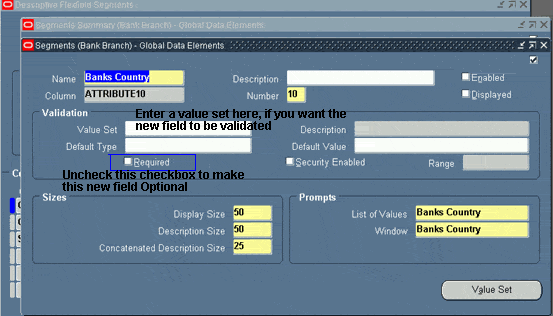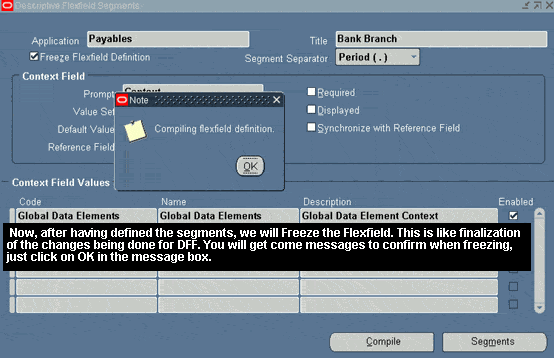 2. Navigate to DFF Segments screen and query on the Title of the “Bank Branch” and Unfreeze the Flexfield and add segments as to Section “GLOBAL Data Elements” as shown in screenshots.