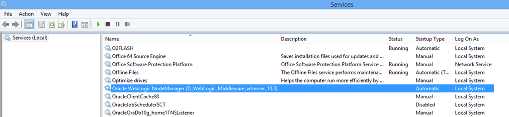 So once we created the Node Manager Service, we can start re-creating the optional service(s). We will limit ourselves to Weblogic Admin Console service, which is the maximum for our exercises. You may refer to our other post about installing & Configuring Weblogic 10.3.6 for details about creating individual services for Forms and Reports services.
