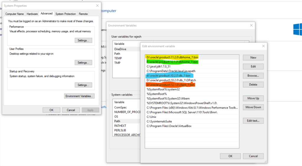 Usually, Windows doesn’t need environment variables set exclusively for the database as Windows registry takes care of it. This is very efficient when the box has only one database running. If you have more than one database or multiple Oracle homes, the scenario changes.