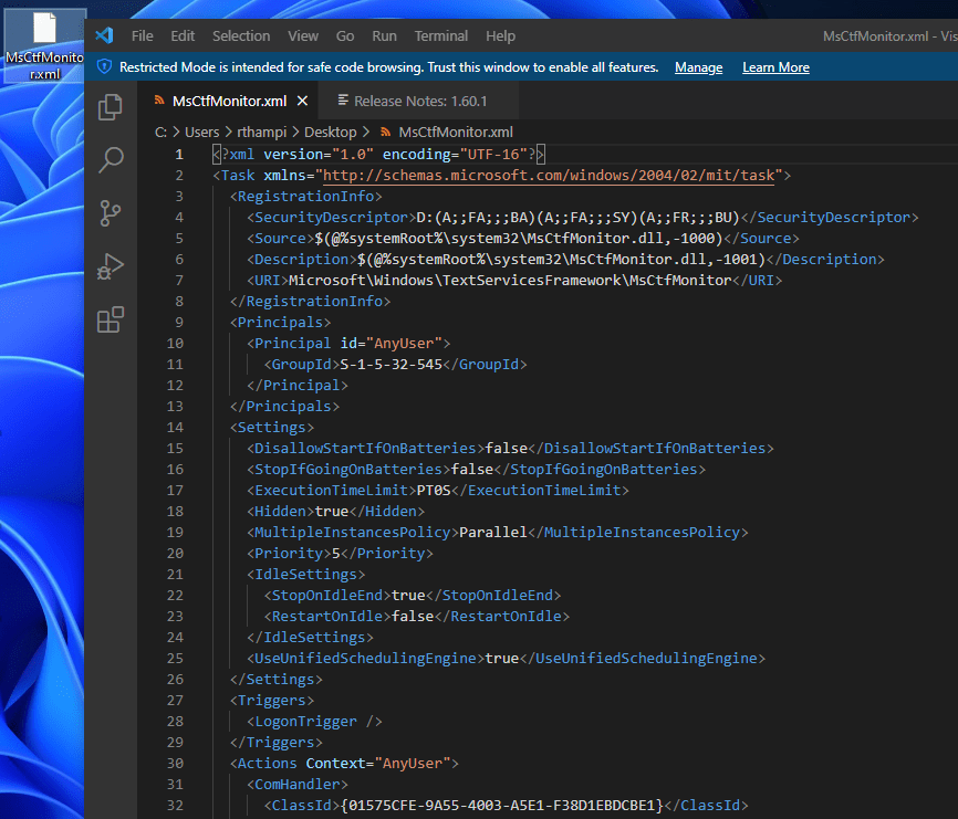 Point to the xml file that you have created in the desktop & apply. This should create a new task under the folder “TextServiceFramework”