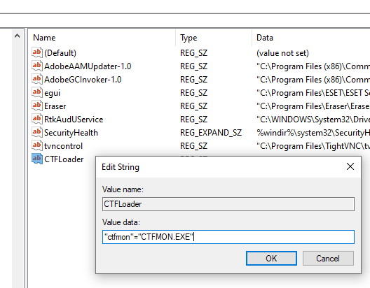 I have called the string key as “CTFLoader” and for the Value make sure to enter “ctfmon”=”CTFMON.EXE”
