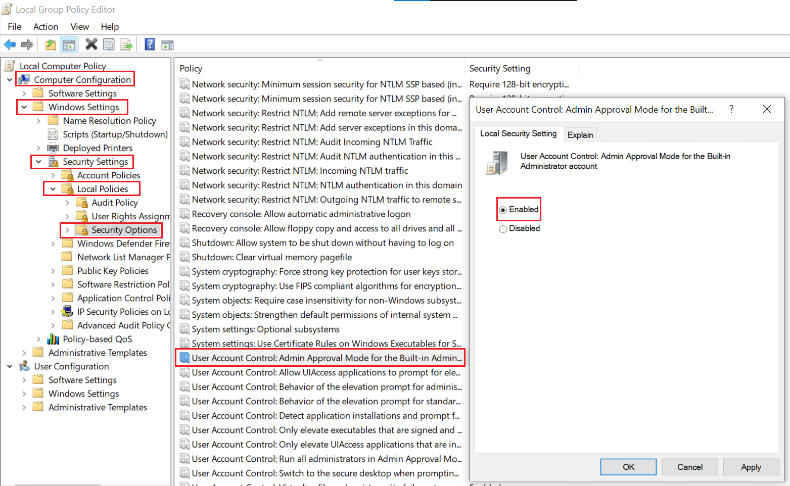 You have to open the node Computer Configuration->Windows Settings->Security Settings->Local Policies->Security Options and configure “User Account Control: Admin Approval Mode for the Built-in Administrator account”. Follow the below image for more details.