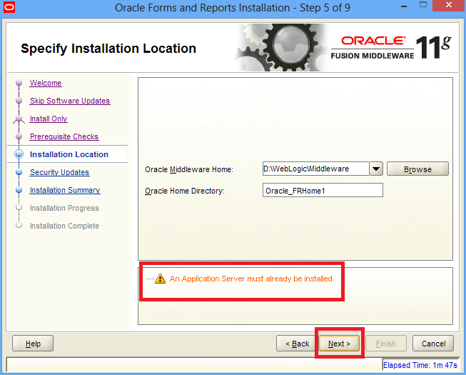 Next page will clearly notify you that you must have an application server already installed. Application server akka Weblogic server. Without Weblogic server you cannot use Oracle Forms and Reports 11g Release 2 even for development purpose.