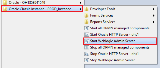Oracle provides batch files to start and stop all the above mentioned components. You may start just WLS_FORMS and WLS_REPORTS services, unless planning to manage them through the Admin Server console.